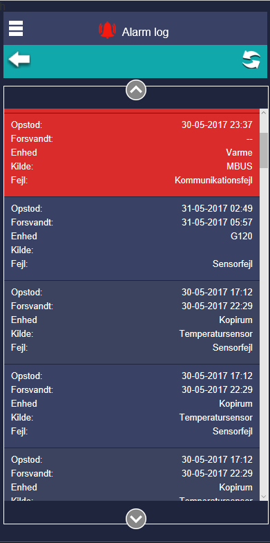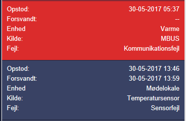 Alarmer angives med Fejltype, kilde tidspunkt for alarmen, samt hvornår alarmen er afsluttet.