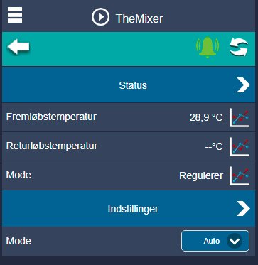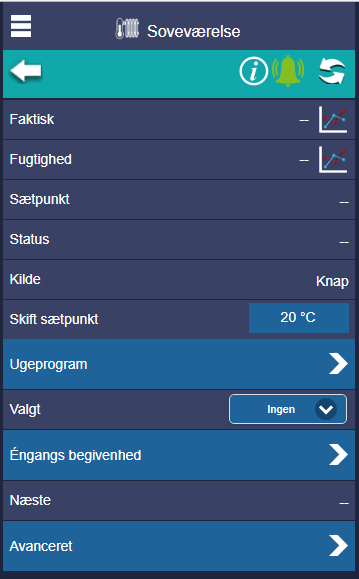 ”Temperatur” Viser den aktuelle temperatur som er målt i Zonen. Trykkes der på grafknappen vises grafen for hvordan temperaturen har udviklet sig historisk.