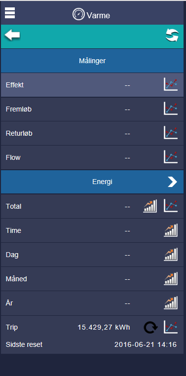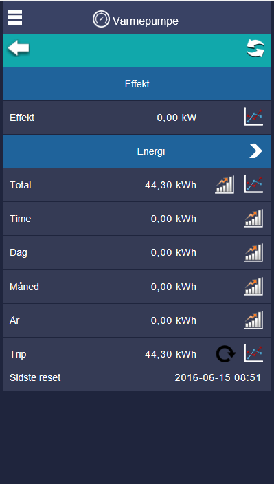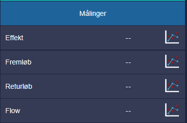Ved at trykke på ikonet graf kan du få et overblik over hvorledes forbruget, produktion eller temperatur har udviklet sig historisk. Her kan du vælge om du vil se for de sidste 8 timer, det sidste døgn, den sidste uge, den sidste måned eller det sidste år