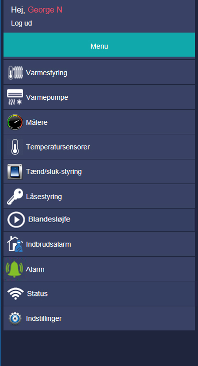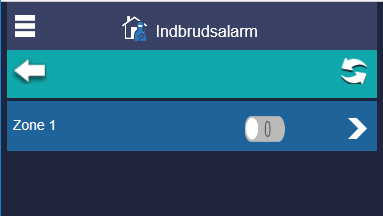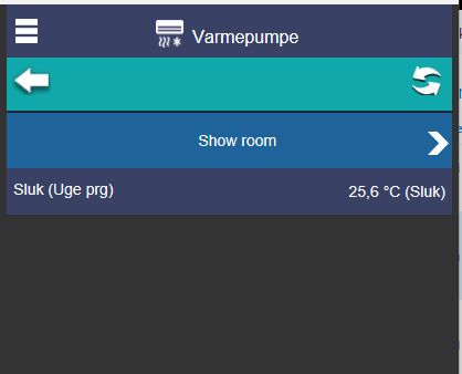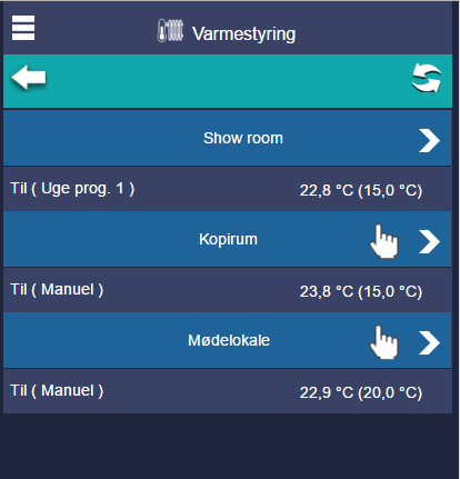 På skærmbilledet ses de zoner som er aktive i din installation. Du kan også her se status på dine varmezoner. Aktuel temperatur vises først og Indstillet værdi vises i parrentes. Ønsker du at ændre indstillinger for en varmezone, trykkes der på den varmezone som du ønsker at administrere.