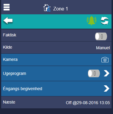 ”Faktisk” Viser den aktuelle temperatur som er målt i Zonen. Trykkes der på grafknappen vises grafen for hvordan temperaturen har udviklet sig historisk.