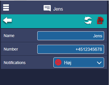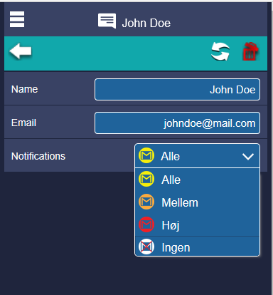 Her du indtaster emailadressen eller mummer, og navn på den du vil sende til og indstiller hvilken afvigelse der ska sendes en besked om - om det skal være de højt prioriterede alarmer – de mellem - de lavt prioriterede eller slet ingen.
