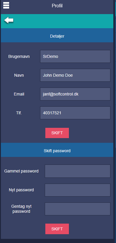”profil” her har du dit brugernavn – navn – email adresse og telefon nr. Det er her du kan ændre dine data hvis der bliver brug for det. Det er også her du skifter dit password. Når du har lavet nogle ændringer her skal du lige trykke på knappen ”opdater” når du er færdig så det tilføjede gemmes.