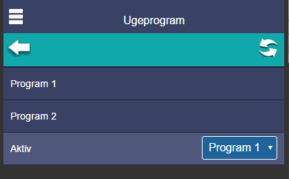 Herfra er der mulighed for at vælge og redigere 2 ugeprogrammer, samt vælge hvilket program der skal være aktivt.