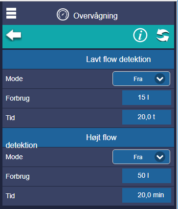 ”Max forbrug” – her kan du indstille max vandmængde og ”High flow tid” – her kan du indstille tidsintervallet for hvornår der normalt er forbrug og hvis mængden overstiger det indstillede, vil det indikere en størrer lækage og det vil så udløse at du får en besked fra systemet.