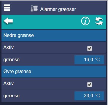 Her kan du aktivere/deaktivere alarmen og sætte øvre og nedre grænse