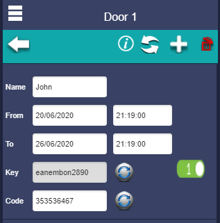 Du kan give et meningsfuldt navn for at huske, hvem du giver adgang. Indstil begyndelses- og slutdato og tid for at definere tidsperioden, hvor koden skal være aktiv. Koden genereres automatisk, når du klikker på knappen til højre, og du finder den i bundlinjen. Der bliver opretet 2 koder. En til ekstern(fx sms) og en til intern på lokal kortlæser, du kan efterfølgede rette den interne kode